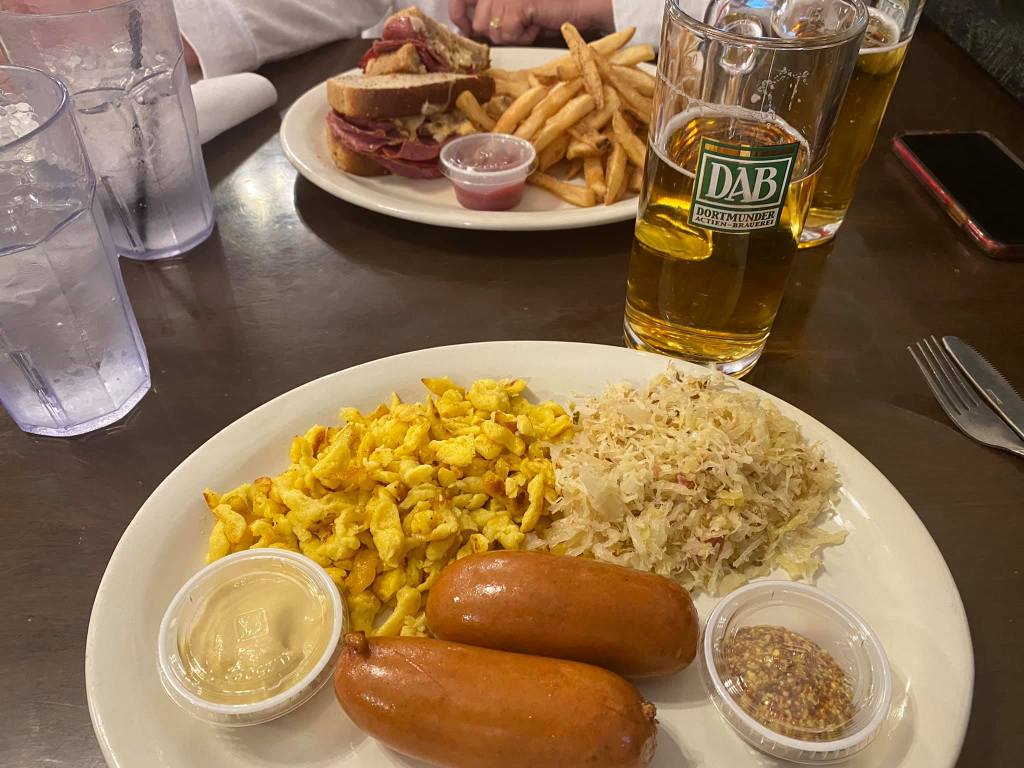 Quickly realizing that it was all gift shops, and we don’t do gift shops (except for the obligatory refrigerator magnet), it was time to find lunch. There was no more obvious place to eat than the Heidelberg Restaurant. I lived within a few miles of that castle for a ½ dozen years and have fond memories of it. I also have fond memories of knockwurst and spaetzle and sauerkraut, served up with a good German beer, Hofbrau in this case. And they delivered, and it was perfect, with great service, wonderful atmosphere, and surprisingly reasonable prices, for a tourist town.