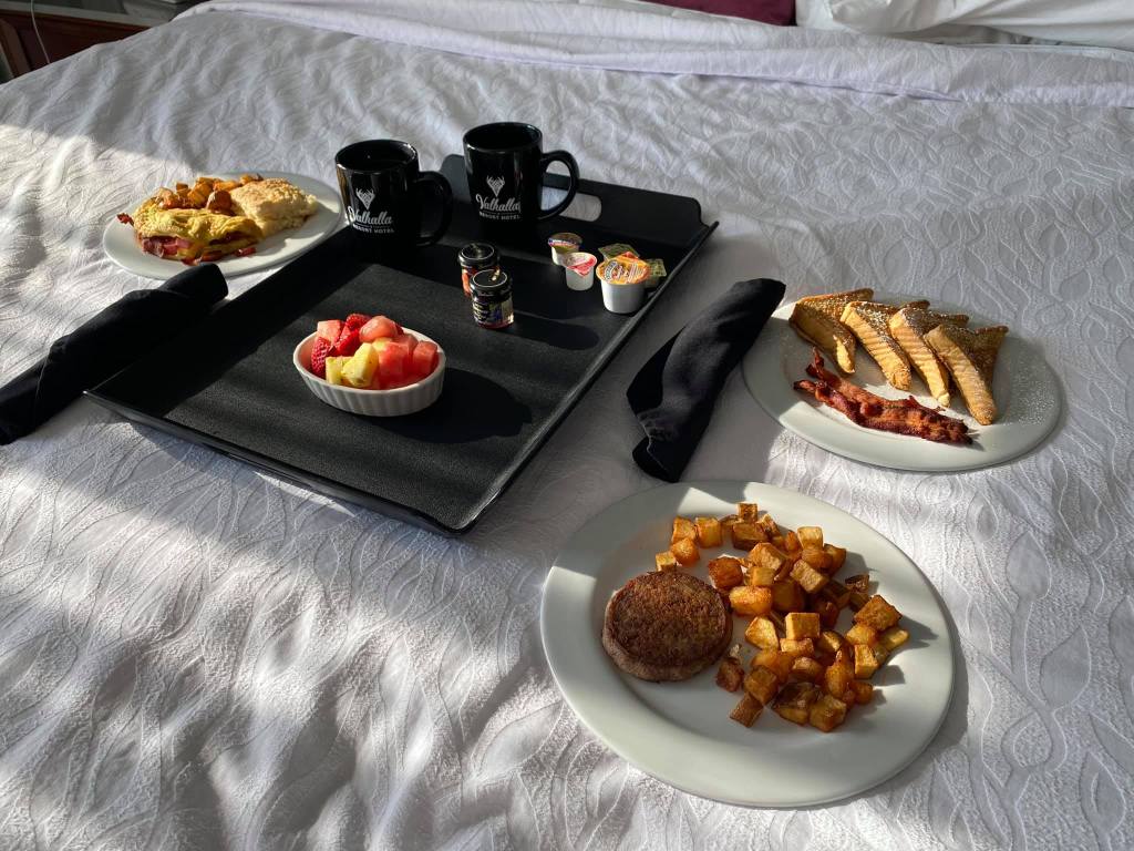 It may seem odd to escape lockdown by locking down, but it did not seem odd to us. Our fabulous suite had everything, including a fireplace and a balcony with a mountain view. We had brought plenty of wine. Room service was available 24/7. We had robes and slippers. We were going to live like rock stars, without the drugs and destruction. I excitedly filled out the breakfast door-hanger to make sure we got served in the morning, and then things got really exciting. We read books and took naps. Hey, we’re old and comfortable with ourselves.