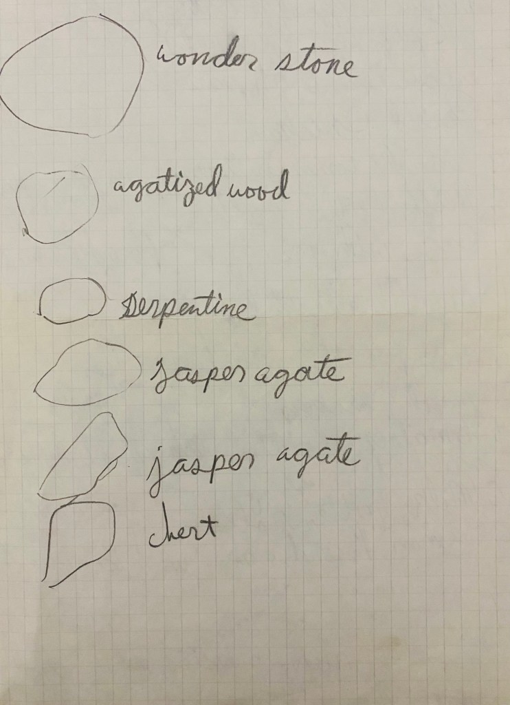 Apparently when Mr. Lobocki wasn’t busy teaching Sunday school or engaging in Cold War espionage, he liked to find and polish rocks. He had a rock tumbling machine in the fourth-floor storage unit along with an amazing assortment of shiny rocks. He wanted me to have some to take home with me, and he proceeded to give me a bag of polished stones. I was stunned – I would not have been more stunned if it had been a bag of gold coins. He took the time to tell me the names of many, and I dutifully scrawled them down in pencil with a rough outline of the shape.