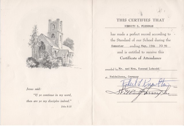 Like most people reading this, I graduated high school. Many of you went on to graduate from college. In my local culture, they celebrate graduating from kindergarten, elementary school, and middle school. But a graduation that may have had the most impact on me, many years after the fact, was from Sunday School in Heidelberg, Germany circa 1970.