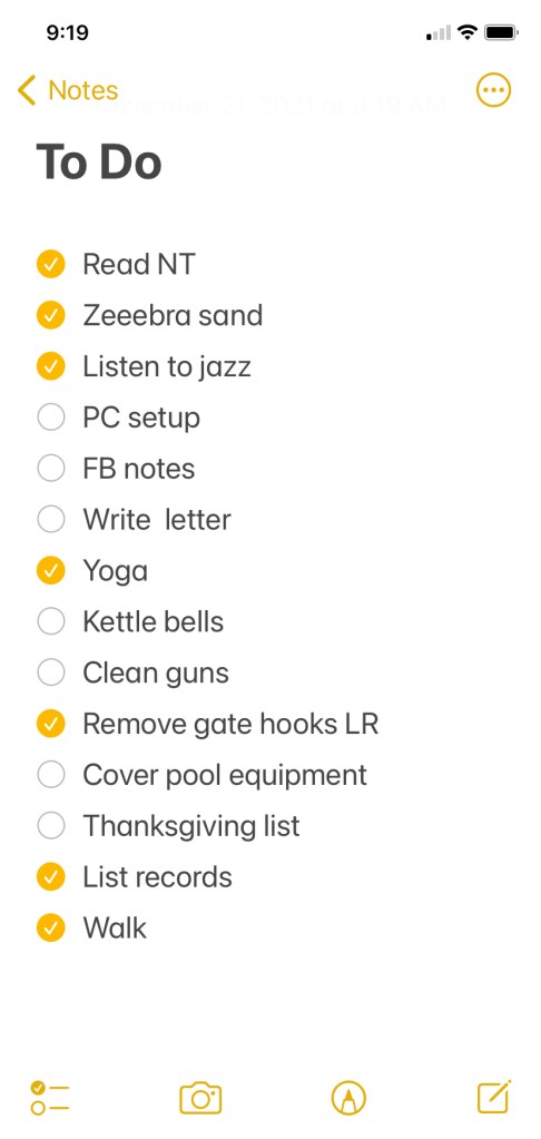 Don’t be concerned – I didn’t get out my Day-Timer (I still have it, almost 30 years later). I didn’t invest in new technology. I simply used the Note app on my iPhone (still the greatest advance in civilization since the wheel) and make a simple bullet point list of things I COULD do that day, if I want to. No pressure, just some ideas to keep me on track. Even when I have little to do, there is satisfaction in noting it, and the endorphin rush of checking it off.